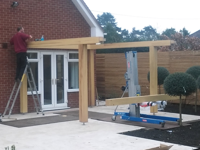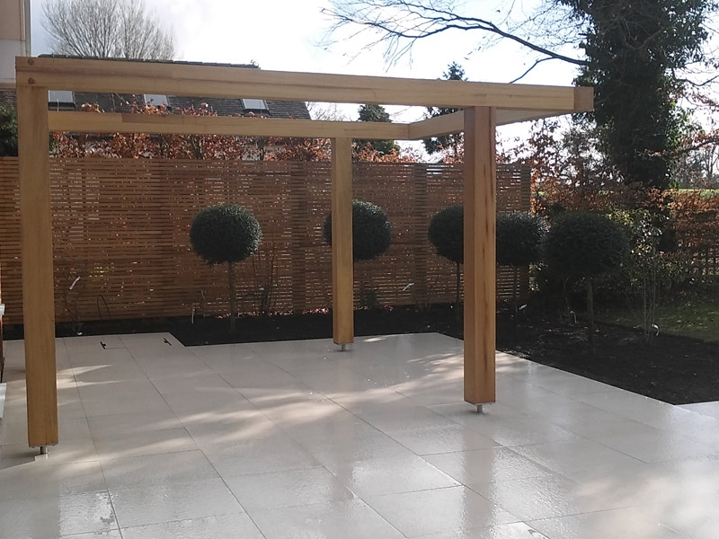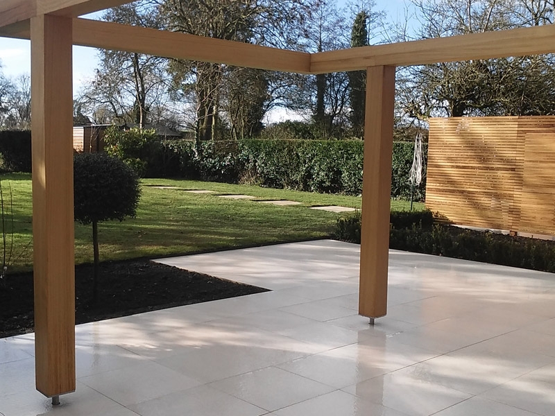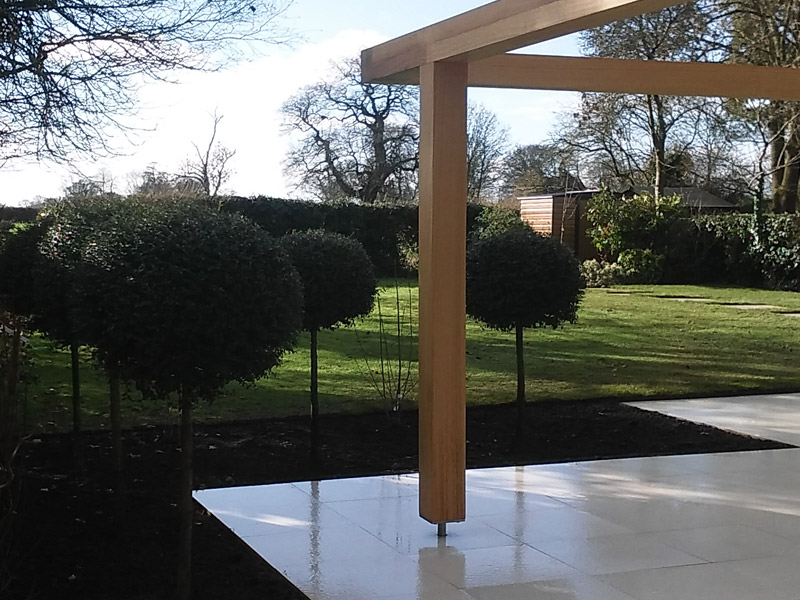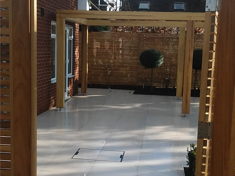 The use of factory finished high end materials from  bespoke hardwood fencing and gates, and chunky Iroko ‘floating pergola’ to perfect Italian porcelain paving, this garden truly proved to be a total transformation.