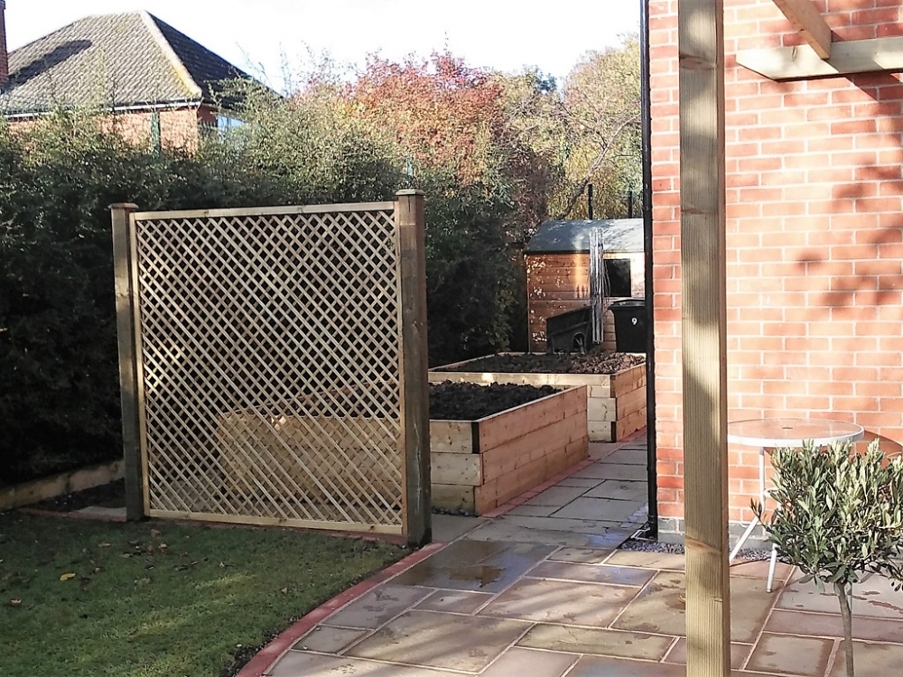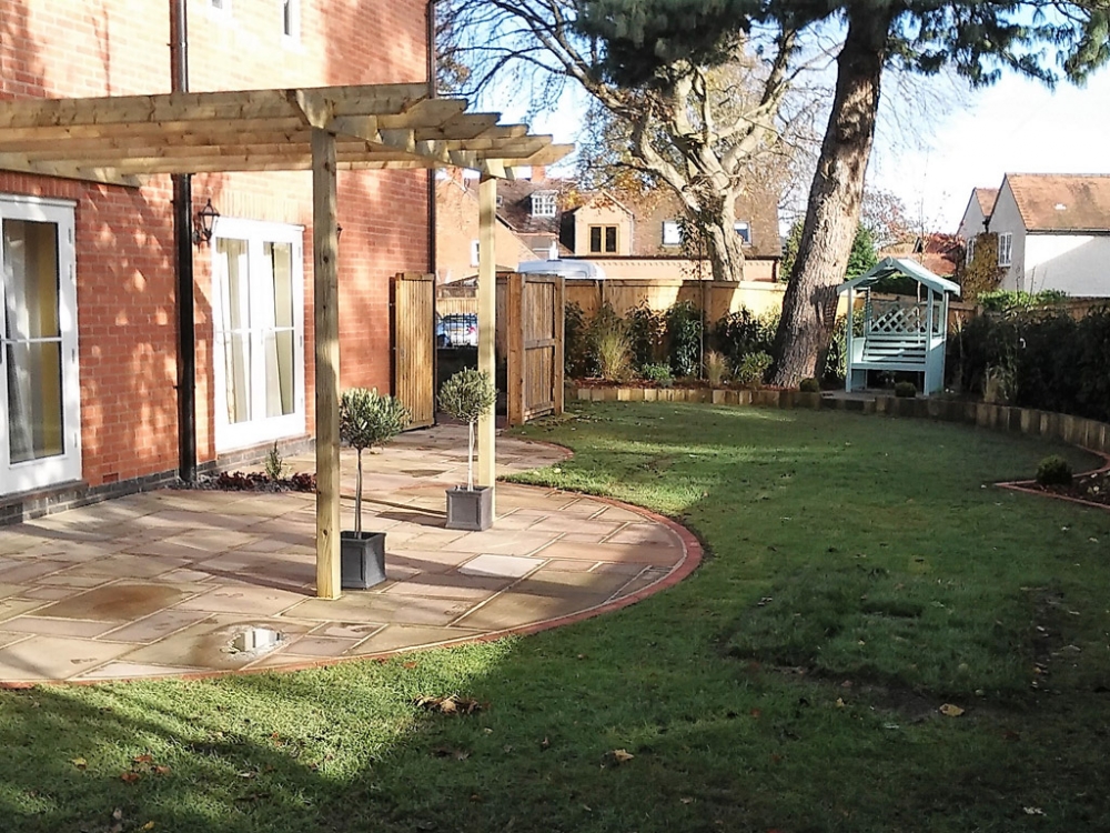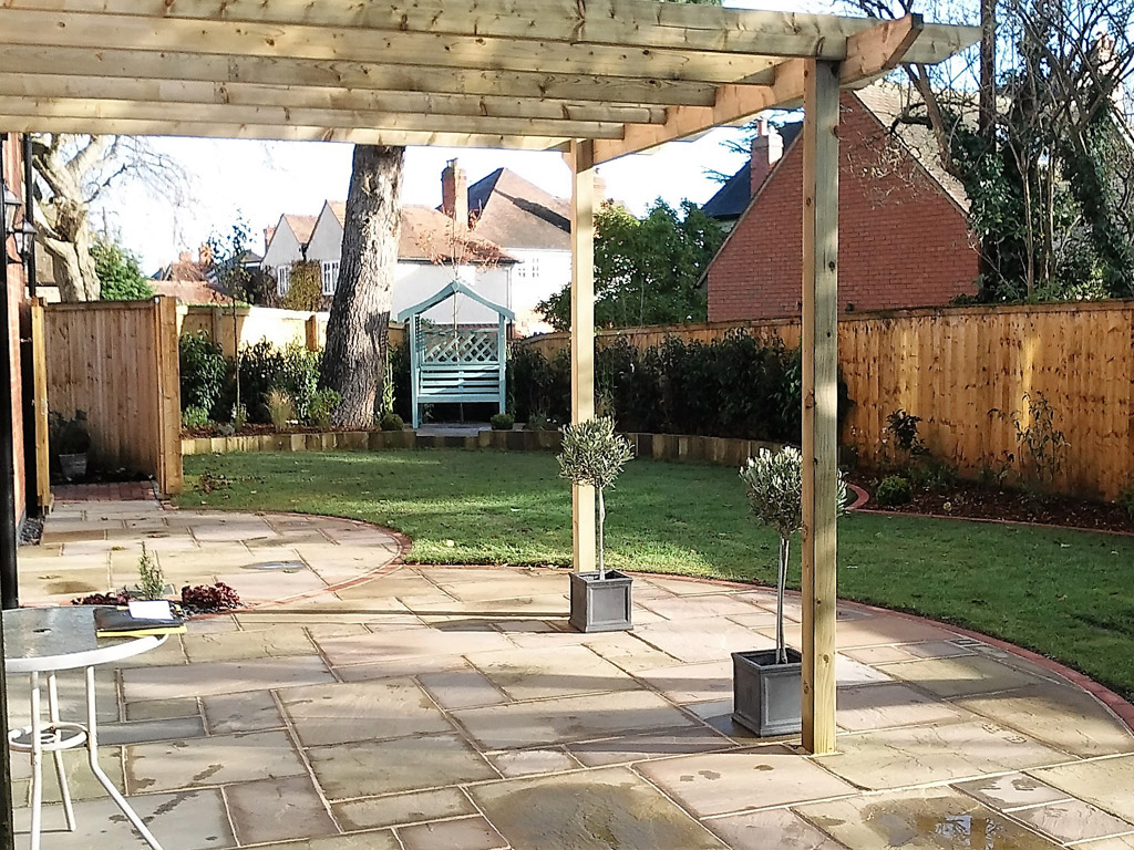 Raising the planting border under the pine allows shallow planting in fresh soil instead of densely rooted ground, and an irrigation system ensures the planting success even here. Bespoke pergola and attractive shade arbour offer focal points and seating options, and ornamental tree and hedge planting will help disguise neighbouring properties.