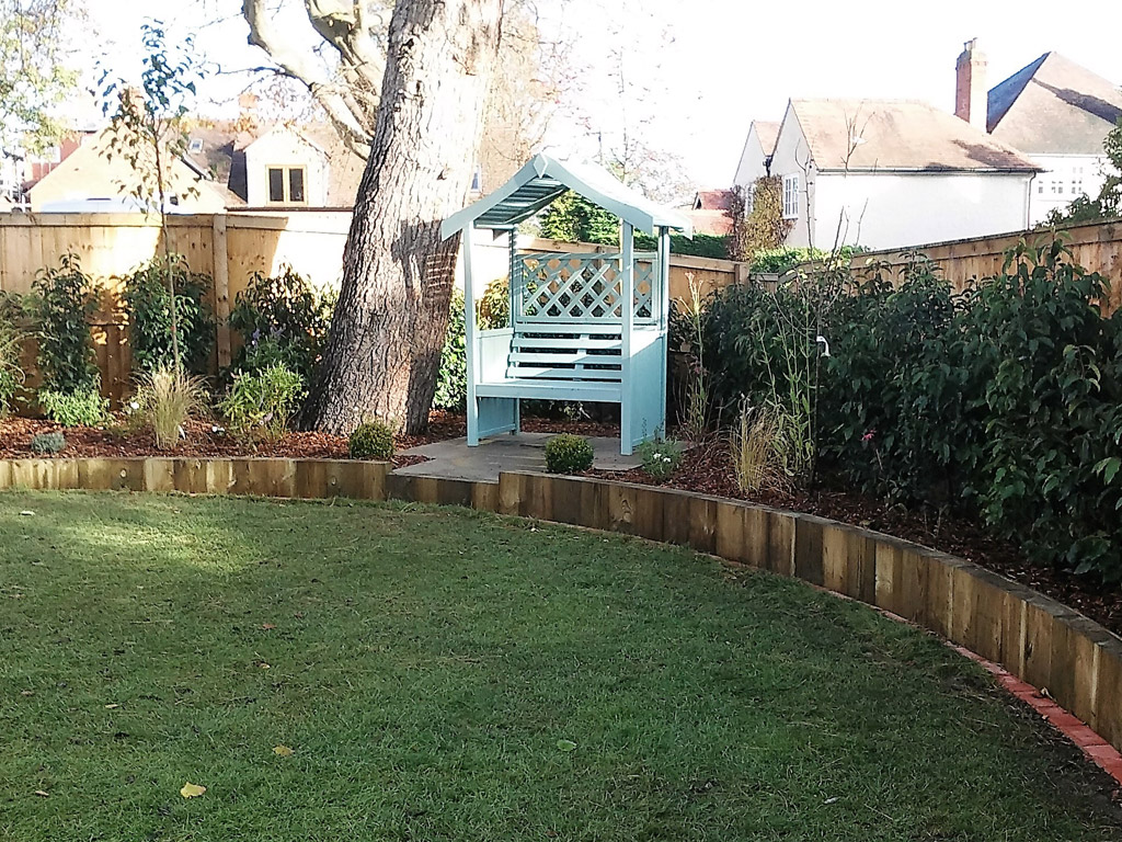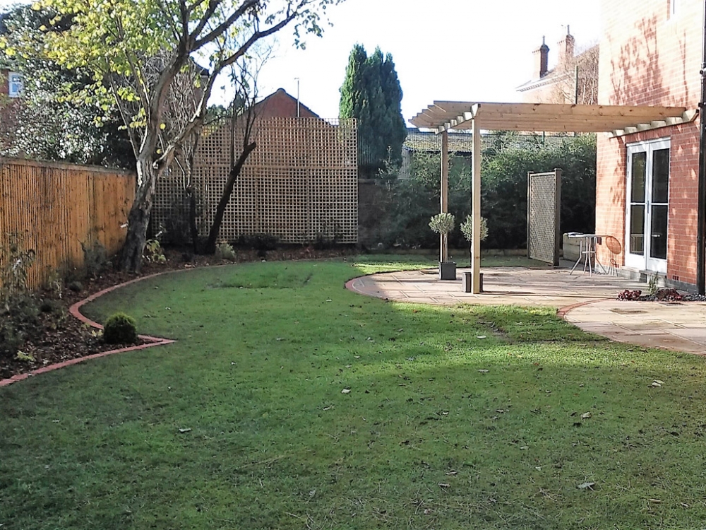 A newly built town garden that just offered a small seating area and little else. Quite long and thin with a dominant pine tree, this garden needed shape and strong curves to detract the eye from the long linear fences.